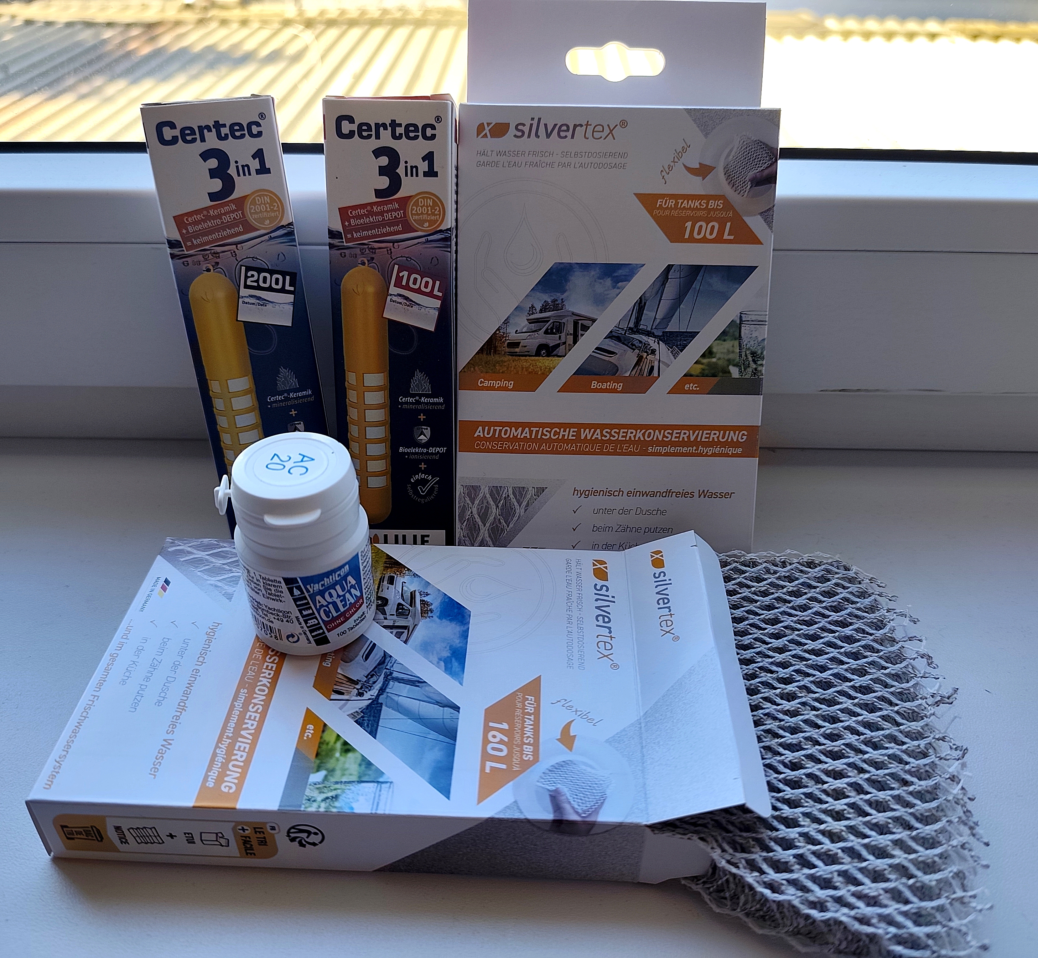 Nádrž je napuštěná novou čistou vodou. Když v nádrži voda stojí déle než 24 hodin, začíná v ní „život“. Máte v podstatě tři možnosti, jak ji udržet pitnou. Pro dlouhodobé cestovatele jsou ideální ionty stříbra. Udrží vodu čistou až 6 měsíců. Jsou k dostání ve formě tablet, sítěk nebo kapslí. Pokud natankujete vodu z neověřeného zdroje, můžete k okamžité likvidaci bakterií použít chlorové tablety. Pro technologické nadšence je možnost čištění bez chemie pomocí světla UV-C lampy. Je to však vyšší investice.