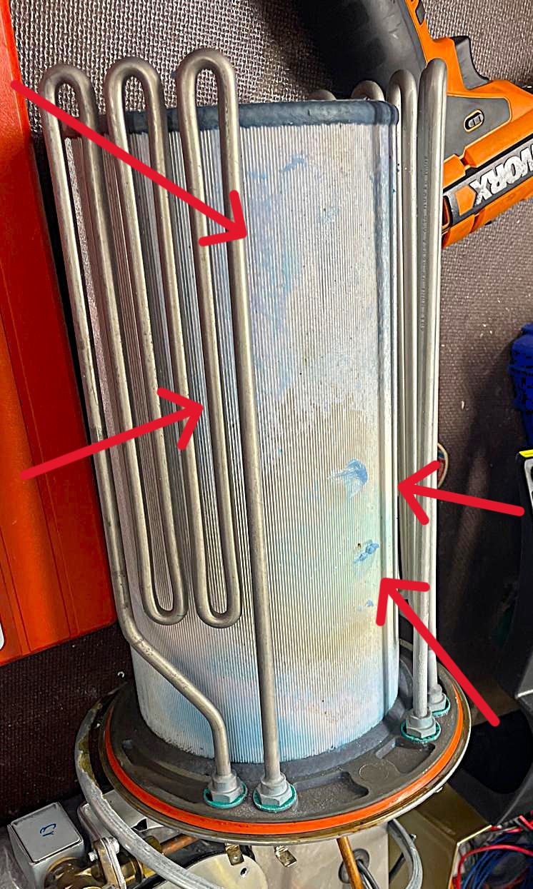 Na obrázcích jsou vyznačené krystaly modré kapaliny na součástech topení.